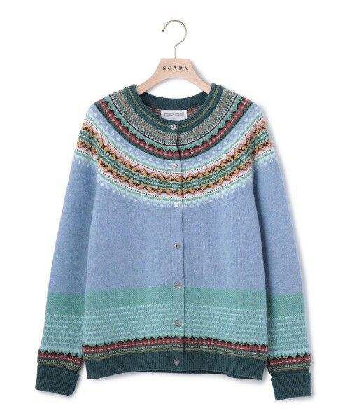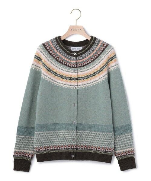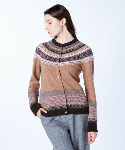 毛をふんだんに用いたニット素材のカーディガン。多彩な幾何学模様を様々な色で表現したフェアアイル調の柄使いで、秋冬らしいウォーミーな着こなしを楽しめます。裾や袖口を配色で引き締めており、賑やかながらもまとまりがあるのも特徴。ネックラインが程良く詰まっているため、1枚使いでも着映えするアイテムです。※商品画像はサンプルを使用しているため、実際の商品と色味などの仕様が異なる場合がございます。予めご了承ください。model:T.175/B.83/W.59/H.89着用サイズ:38