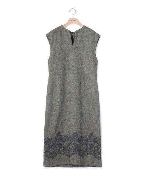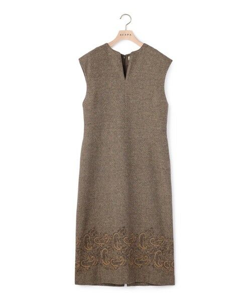 ツイード素材のスリーブレスワンピース。裾にあしらった、ペイズリー柄の刺繍デザインがポイントとなっています。ネック部分はスリット入りで、首もとにちょうど良い抜け感をプラス。一枚着でカーディガンやジャケットを羽織ったり、インにタートルニットやブラウスを重ねたり、自由なスタイリングで取り入れることができます。もたつきのないすっきりシルエットです。