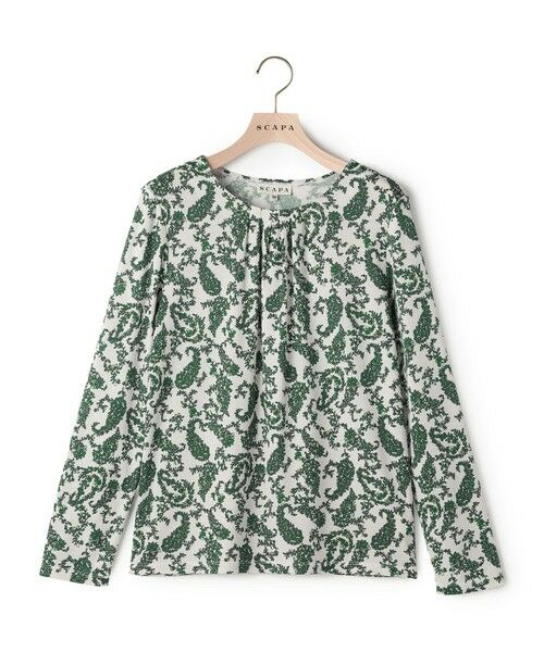 プティットフルール(小さな花)の総柄プリントが華やかなデザインのクルーネック長袖カットソー。首元のタックが立体感のあるドレープを作り、フェミニンな雰囲気を演出。毛混合のあたたかみのある肌触りで秋冬シーズンにぴったり。一枚で、または重ね着でコーディネートの幅が広がるアイテムです。