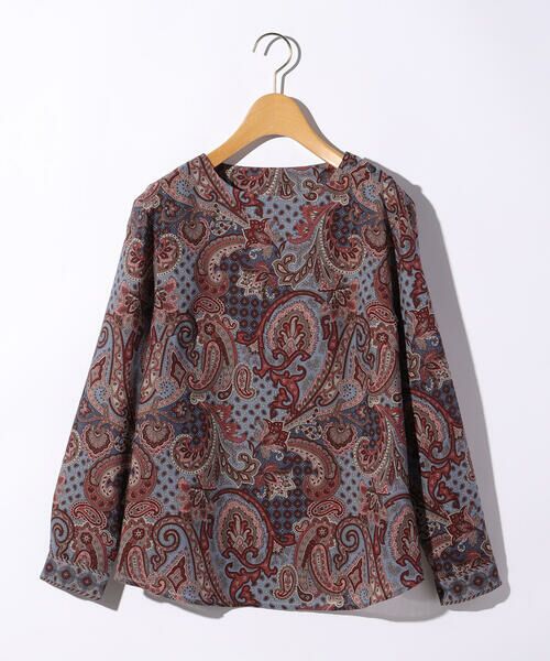 ペイズリーの総柄が華やかな印象のブラウスです。肩にくるみボタンが配され、着脱が可能です。袖にはカフスが施され、上品な一着です。一枚で華やかになりますので、シンプルなボトムスにタックインさせてすっきりとした着こなしや、アウトスタイルでリラックスした着こなしもおすすめです。