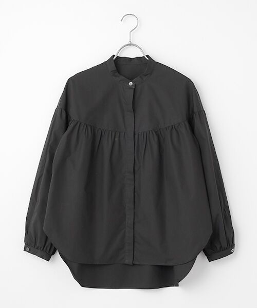 <人気スタイリスト大草直子さん監修ショップ>ハリのある生地とスタンドカラーで上品なブラウス。肩下のギャザーとボリューム袖で1枚でも着映えます。羽織りとしても使える着回し力でコーディネートの幅を広げてくれます。