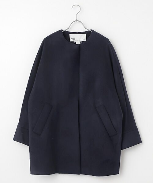 <人気スタイリスト大草直子さん監修ショップ>ゆったりとしたサイズ感ですが、小柄な方にもきれいに着こなせる長さで、羽織るだけでこなれ感のあるスタイルにまとめてくれます。首元はシンプルなノーカラーデザインなので、スカーフやストールなども合わせやすいデザイン。