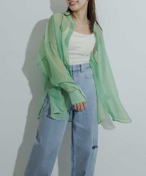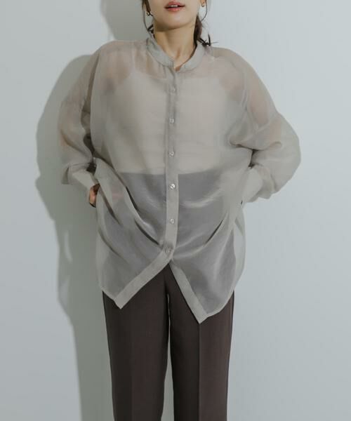 〇程よい透け感と光沢感のある生地が目を引くオーバーシャツ
