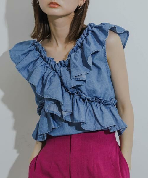 フリルのボリュームがあるので丈は短めなので、ハイウエストなワイドボトムや、スカートとの相性が良く、スタイルアップします。