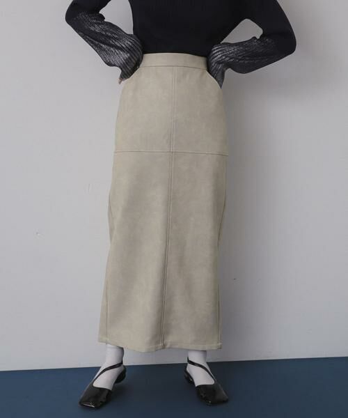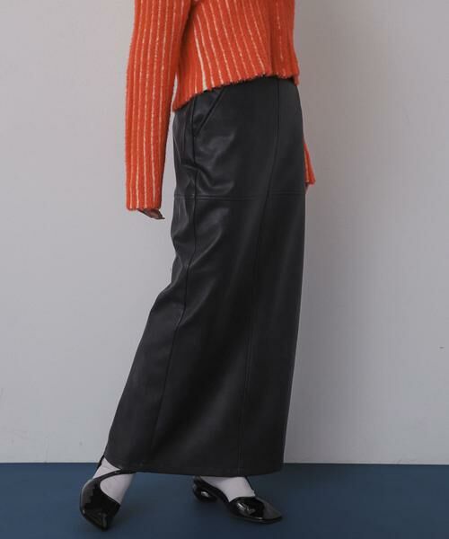 シーズンムード高まる素材感が素敵なレザースカートはシャツ+ビスチェでトレンドスタイルもよし、コンパクトニットなどで綺麗めにもきていただけオンオフ着回しのきくアイテムです。切替デザインがヒップ周りに入っておりスタイルアップが叶います。