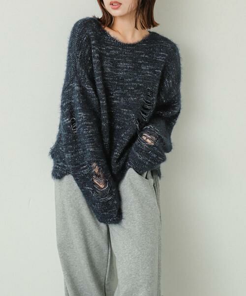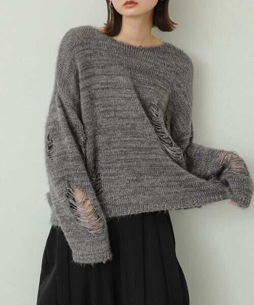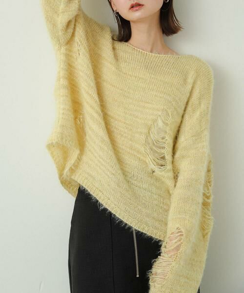 女性らしいシャギーや華奢な糸をミックスさせたルーズニットにダメージ加工を施したアイテム。秋口はキャミと合わせてヘルシーな肌見せが叶います。
