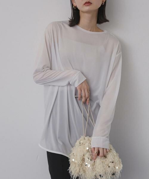 今の時期から着用できるこちらのトップスは、滑らかな肌触りで着心地◎程よい透け具合で抜け感もばっちり!一枚で着てもお洒落見えが叶うアイテムですが、寒くなる時期はクロップドのニットと合わせてレイヤードしても◎