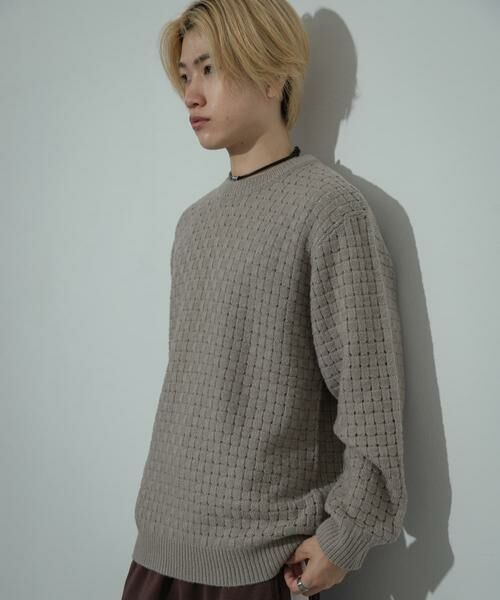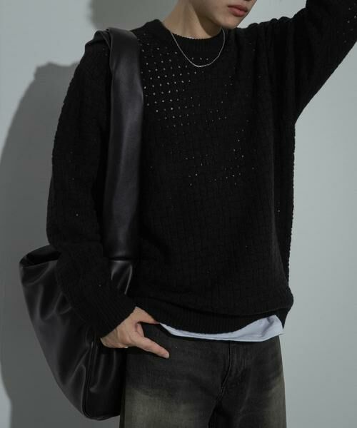 クロス編みが今年らしいシアーな表情のクルーネックニット