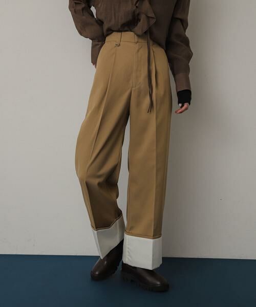 ターンバックデザインが目を引くパンツは組み合わせが広がる万能アイテム。脚長効果も出来るシルエットで、ボリューム感のあるニットとの相性も抜群です〇