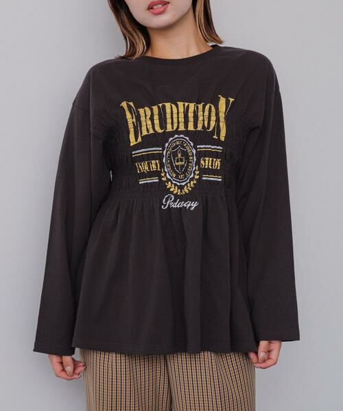 秋コーデにプラスワンしやすい、一枚で着映えできるグラフィックT!お持ちのカットソーとも差別化しやすい、ウエストにギャザーが施されたデザインで合わせるボトムスも自由自在◎お腹周りもスッキリ魅せてくれる万能アイテム!一枚での着映えも抜群ですが、ジャケットなどのアウターと合わせるのもおすすめです!