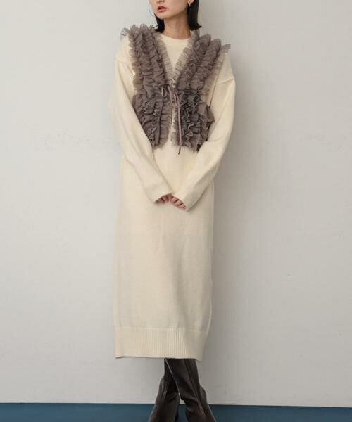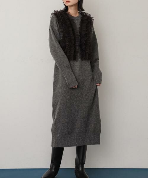 やわらかいニット素材のハイネックワンピース、寒い季節でも首回りが暖かくリラックスな着心地でありながら、取り外し可能のチュールベストがワンピースを彩ってくれる一枚です◎ブーツ合わせがおすすめですが、スニーカー合わせでカジュアルダウンに落とし込むのも◎