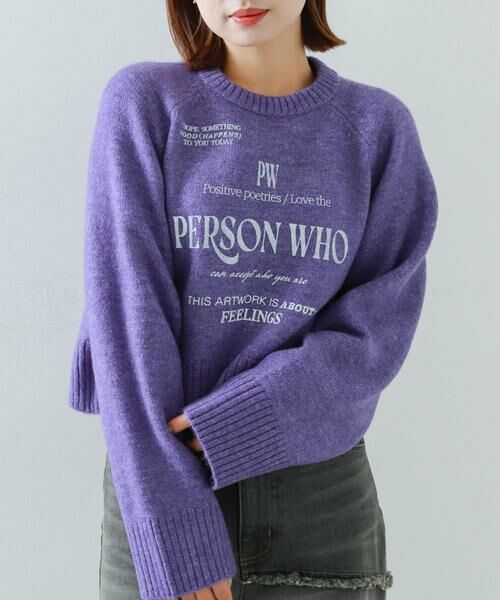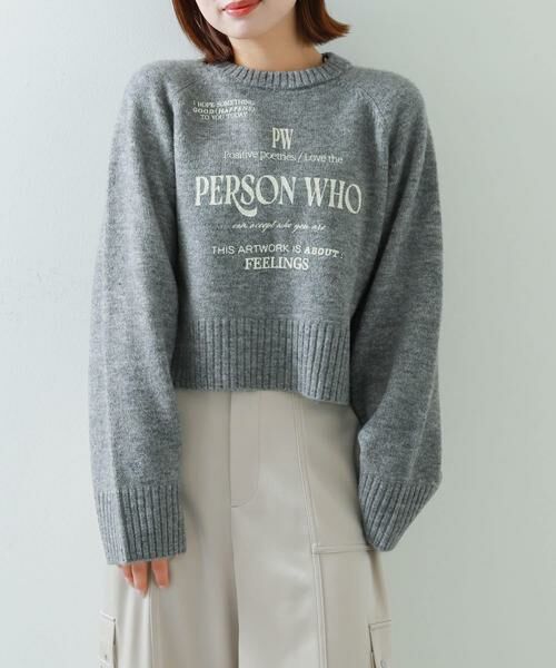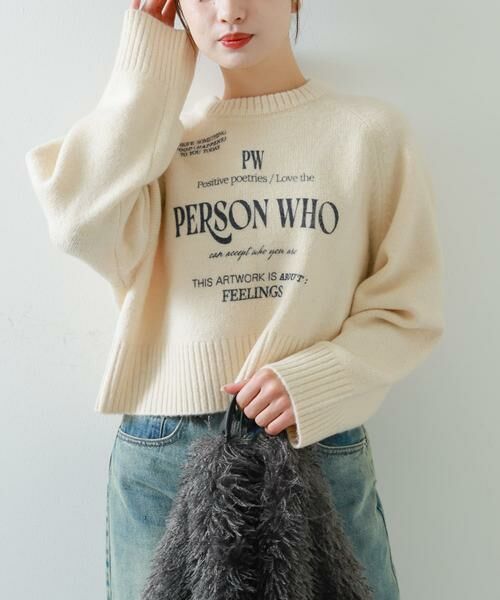ニュアンスフォントが大人可愛いプリントを今年らしくニットに落とし込んだ一枚◎ゆったりめの身幅ですがもちもち素材で柔らかくコートの中にも着込める嬉しいサイズ感◎すっきりとしたクロップド丈の為ボトムスも幅広く、スタイルアップコーディネートに仕上げてくれます。