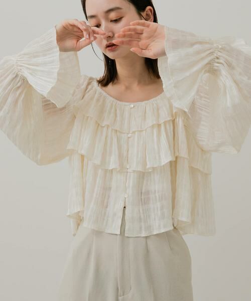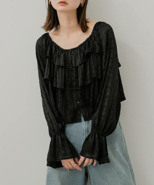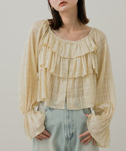 衿ぐりがゴムになっているので、オフショルダーのブラウスとしても着用できます。カジュアルなデニムやチノパンツとの合わせがおすすめです。