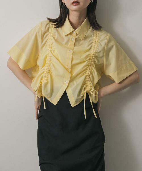 〇シャーリングディティールがシャツに表情をつけ甘さをプラス。丈を調整できる
