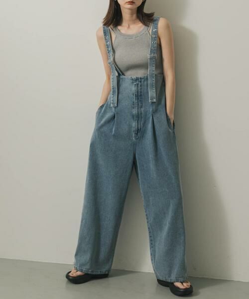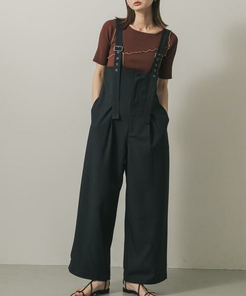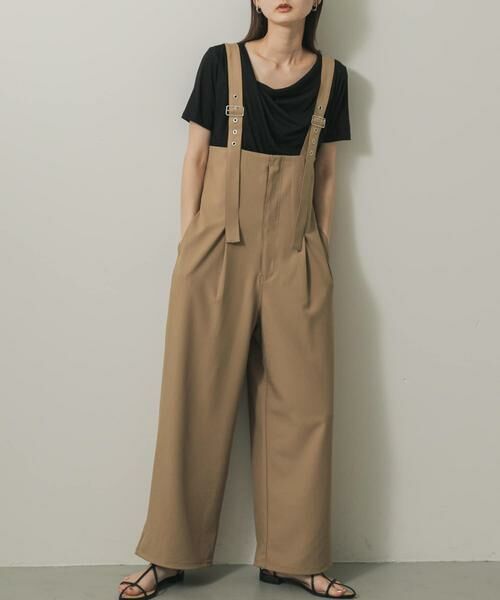 〇ゆるっとしたサロペットにウエストタックを入れることで自然な立体感と細見え効果抜群