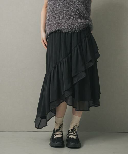 【サイズ感】膝下丈で、アシンメトリーなデザインが特徴です。ウエストゴムで着心地は楽ちん。ティアードのデザインが、さりげなく体型をカバーしてくれます。