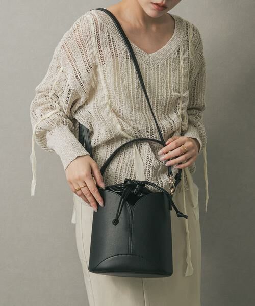 程よい光沢感のある素材が上品な印象の巾着バッグ。特徴的な外側のデザインと内側のギャザーを寄せた巾着のバランスが、洗練された雰囲気を演出します。取り外し可能なショルダーストラップが付いているので、気分やスタイルに合わせて持ち方を変えられるのも魅力。通勤スタイルから休日のお出かけまで、様々なシーンで活躍してくれる万能アイテムです。