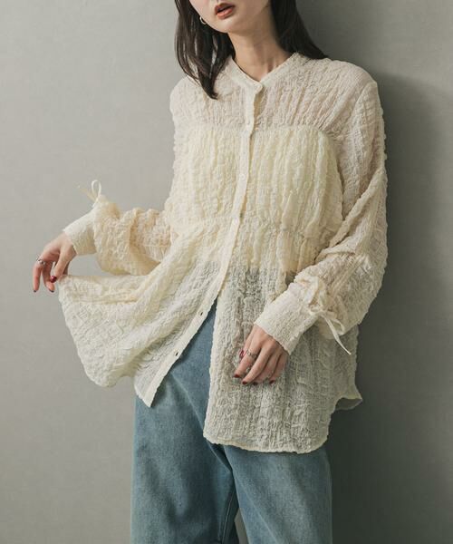 表面感のある素材が、着こなしに奥行きを与えてくれるブラウス。ウエストと胸元に施されたシャーリングが、まるでビスチェを重ね着しているかのようなトレンド感のあるデザインです。袖口の紐を絞れば、シルエットの変化も楽しめます。シンプルながらもデザイン性が高く、一枚でコーディネートの主役になるアイテムです。