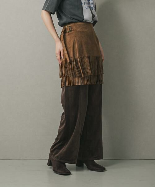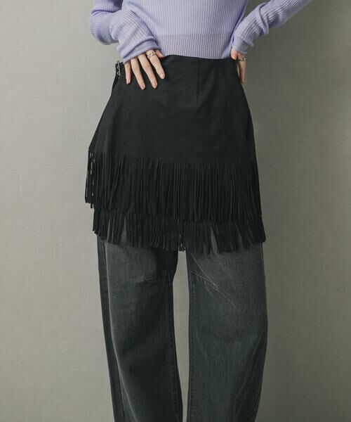 裾にあしらわれたフリンジが、動くたびに揺れてコーディネートに表情をプラスします。一枚でミニスカートとして、またはパンツとレイヤードして着こなすのもおすすめです。シンプルながらも存在感があり、いつものスタイルをアップデートしてくれるアイテムです。