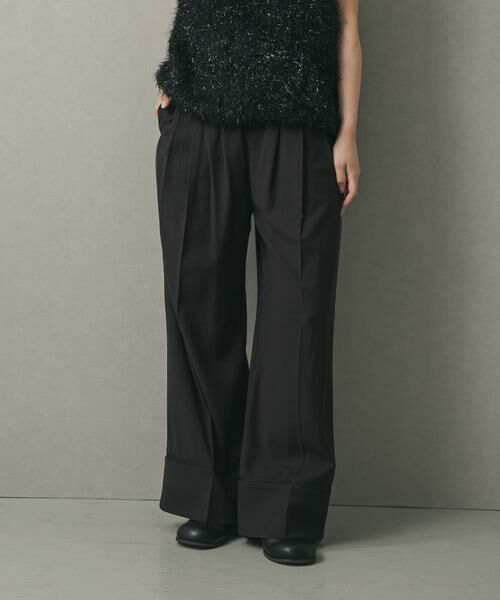 キレイめな素材感とワイドシルエットが魅力のスラックス。左右に3本ずつ入ったタックが、動くたびに美しいドレープを作り、スタイルを美しく見せてくれます。裾の折り返しと脇に挟み込んだシアー素材が、シンプルな中にさりげない個性をプラス。ブラウスと合わせてオフィススタイルに、Tシャツと合わせてカジュアルに、と様々なシーンで活躍します。