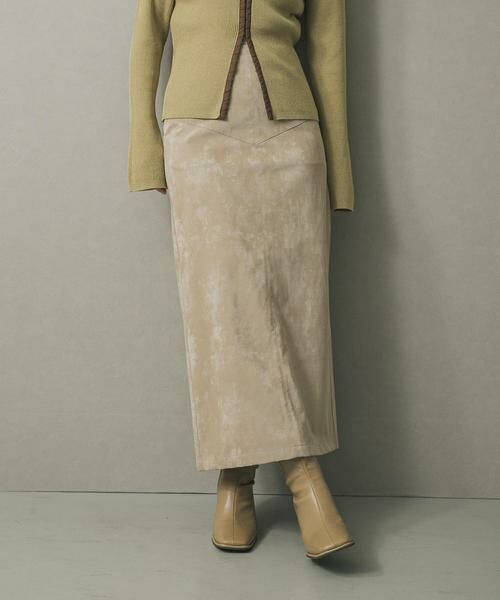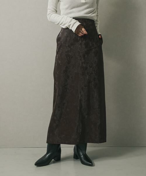 ランダムな光沢感が上品なフェイクレザーを使用した、Iラインスカート。すっきりとしたシルエットで、脚のラインを美しく見せてくれます。ナチュラルなストレッチ素材なので、タイトすぎず快適な履き心地。Tシャツやニットと合わせて、大人のきれいめカジュアルスタイルを楽しめます。