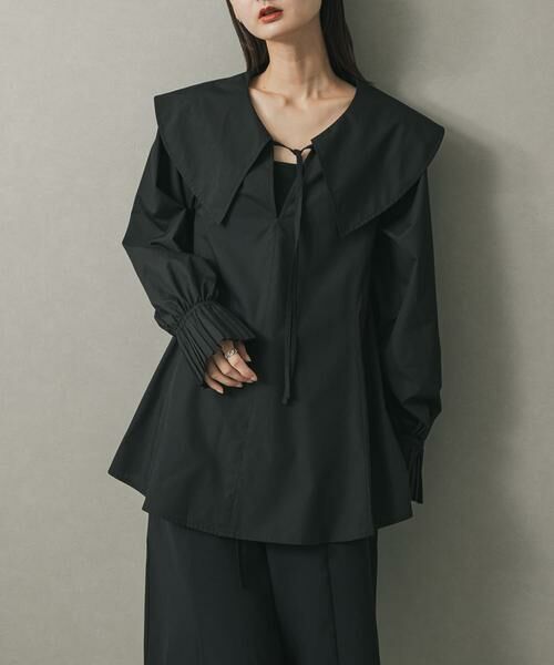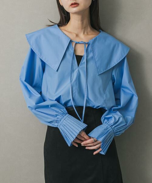 ハリ感のある素材が、着るだけで美しいシルエットをキープしてくれるブラウス。トレンドの大きな襟とスキッパーデザインは、顔まわりをすっきりと見せてくれます。袖口には、目を惹くプリーツデザインのカフスを施し、手元を華やかに演出。パンツにもスカートにも合わせやすいので、様々な着こなしが楽しめます。