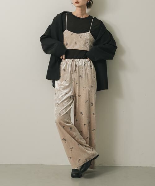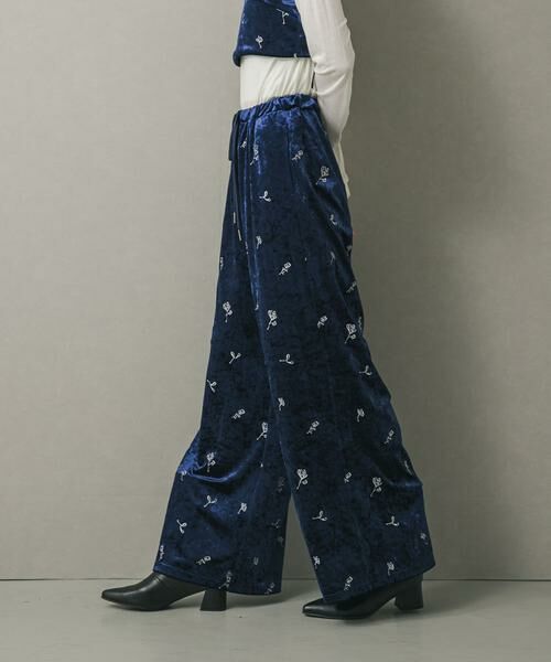 柔らかく、肌触りの良いベロア素材を使用したイージーパンツ。全体に散りばめられた、オリジナルの小花柄刺繍が可愛らしいアクセントになります。ゆったりとしたシルエットですが、すとんと落ちるラインなので、リラックス感がありながらもすっきりとスタイルアップして見えるのが魅力。おうちでのリラックスタイムから、ちょっとしたお出かけまで、幅広いシーンで活躍します。