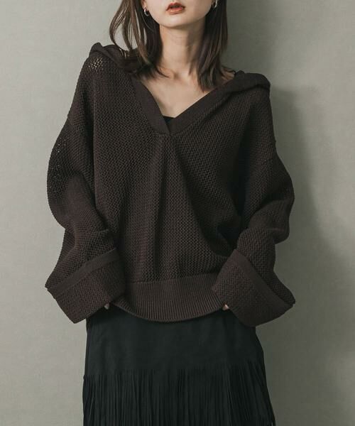 ざっくりとしたメッシュ編みがトレンド感のあるニットパーカー。ゆったりとしたルーズなシルエットで、着るだけで抜け感を演出します。スキッパーデザインなので、首まわりがすっきり見えて女性らしい印象に。Tシャツやキャミソールとレイヤードして、様々な着こなしを楽しめるアイテムです。