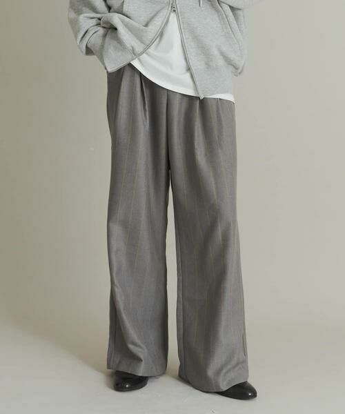 シンプルなニットやスウェットと合わせるだけで、パンツのシルエットと素材感が際立つ着こなしが完成します。同シリーズのウールタッチストライプバンドカラーシャツと合わせたセットアップスタイルは、それだけで洗練された雰囲気を演出できます。きれいめなジャケットと合わせれば、都会的な大人カジュアルスタイルに仕上がります。
