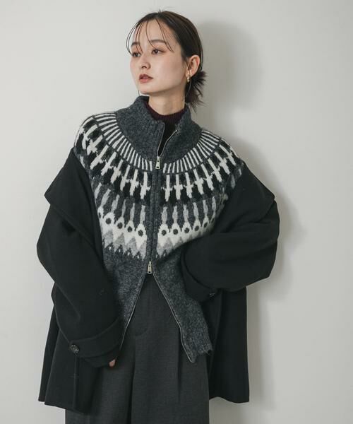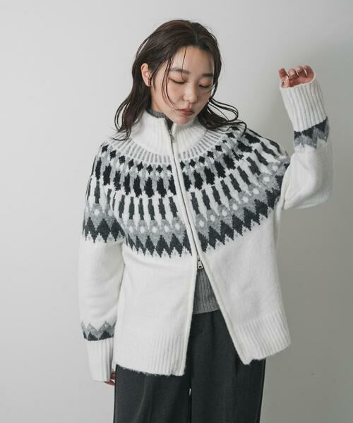 起毛感ともちもちとした柔らかな肌触りが魅力のニットカーディガン。冬ムード満点のノルディック柄が、シーズンライクなスタイルを完成させます。ハーフジップのデザインが、シンプルな中に程よい抜け感をプラス。ボトムスを選ばない丈感なので、着回し力抜群のアイテムです。