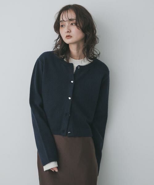 柔らかく肌触りの良いニット素材を使用したカーディガン。今年らしいクロップド丈なので、ハイウエストのボトムスと合わせるだけでスタイルアップが叶います。フロントに並んだメタルカラーのニュアンスボタンが、シンプルな中に洗練された印象をプラス。ボタンを閉めてトップスとして着るのもおすすめです。