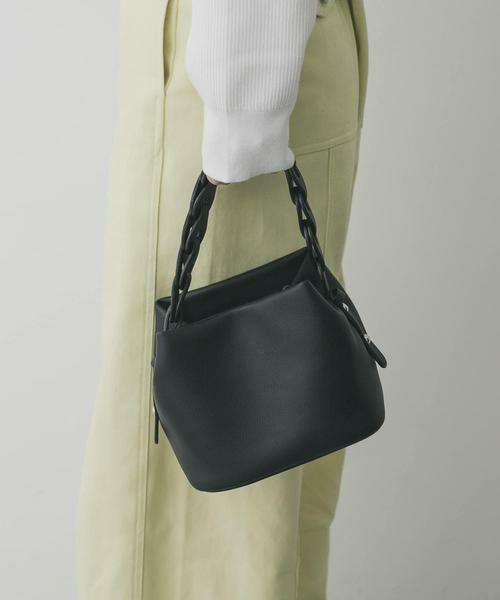 柔らかいフェイクレザーを使用したハンドバッグ。コロンとした丸みのあるシルエットが、女性らしい柔らかな印象を与えます。目を引く太めのチェーンハンドルが、シンプルなデザインにモードな華やかさをプラス。アクセサリー感覚で持てるサイズ感で、いつものコーディネートをワンランクアップしてくれるアイテムです。