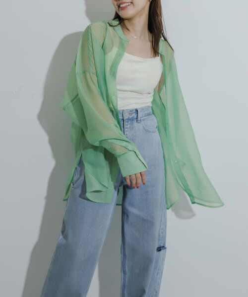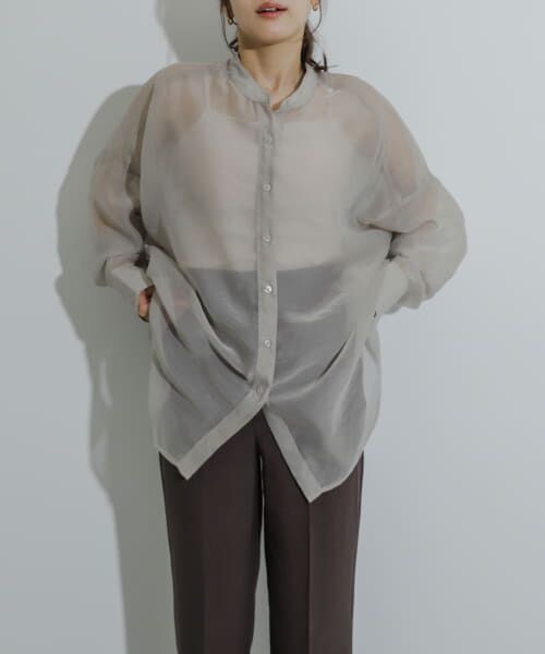 〇程よい透け感と光沢感のある生地が目を引くオーバーシャツ