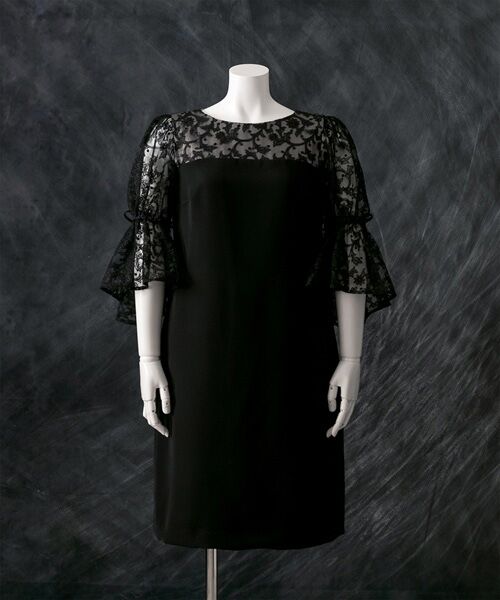 透け感の美しい繊細なチュールレースを使用しケープのようなボリュームを出し、贅沢で華やかなフレアスリーブに。袖のリボンテープを縮めて分量調節することもできギャザーの寄せ加減でデコラティブな袖にアレンジ可能。ボディーは膝下丈のコンパクトな量で袖のボリューム感とメリハリのあるバランスが特徴です。以前ご好評いただいたデザインをさらに誰でも使いやすいシルエットにリニューアルしたおすすめのドレス。レースは部分使いなので、華やかなシーンはもちろんコーディネートでデイリーなお出掛け、お食事など様々なシーンで活躍します。便利な左右ポケット付きです。