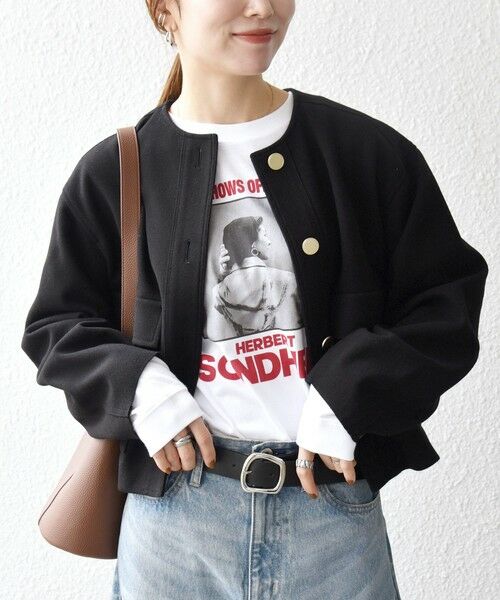 切りっぱなし仕様で軽やかな、ショート丈のノーカラージャケット。