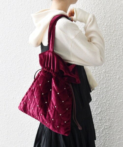 ラインストーンを表地にあしらった、巾着型のトートバッグ。