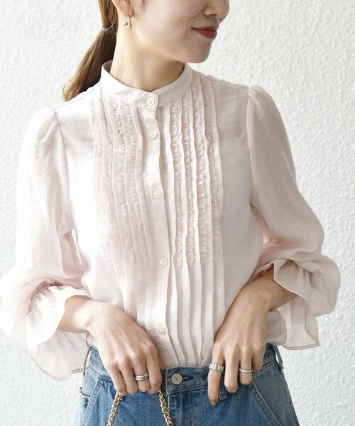 低めのスタンドカラーとフロントタック&切りっぱなしのフリルをあしらった大人可愛いデザイン。