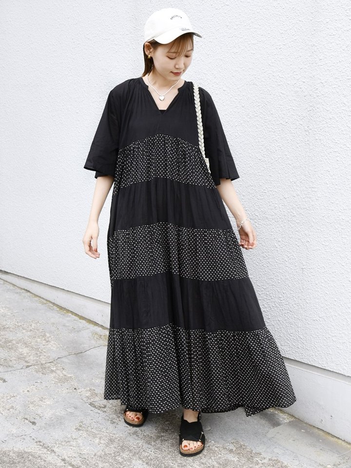 無地とピンドットプリントを組み合わせた大人のティアードワンピース。