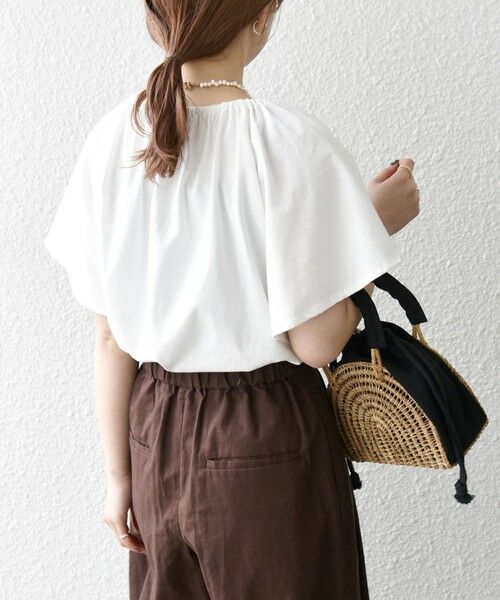 シンプルながらも、襟ぐりのギャザーや袖周りのふんわりとしたデザインがポイントに◎
