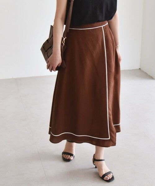 配色のパイピングとラップでデザインがアクセントになるスカート。