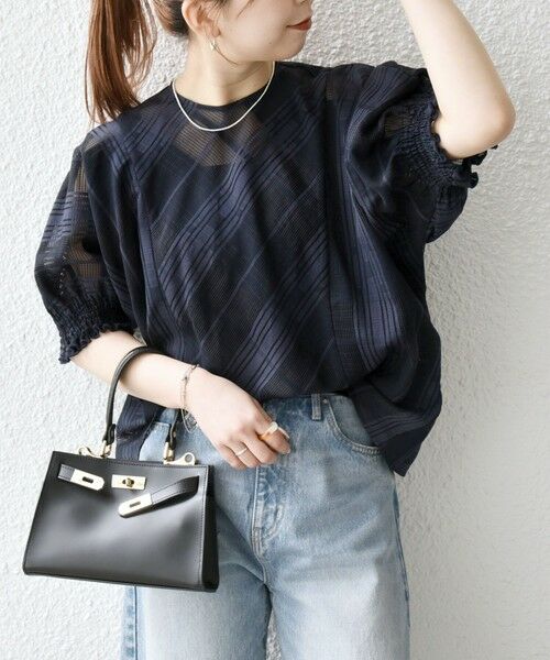 さりげないチェック柄のシアー素材が、女性らしさのあるブラウス。