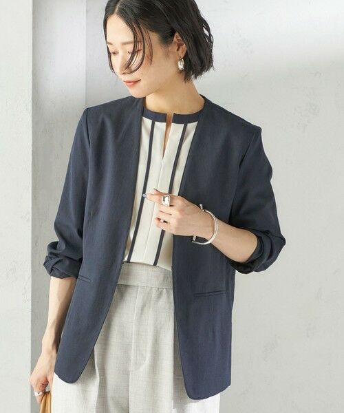 ネックラインにカーブを施し、優しいVラインに仕上げたカラーレスジャケットです。