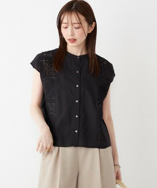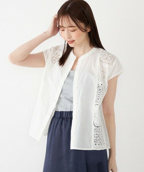 軽やかなコットン素材に、今季注目のレースをパッチワーク風にあしらった、清涼感あふれるデザインシャツ。