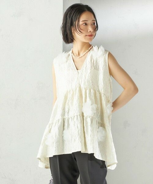 花のモチーフが印象的なため、シンプルなパンツと合わせてブラウスを主役に際立たせるコーディネートがおすすめです。
