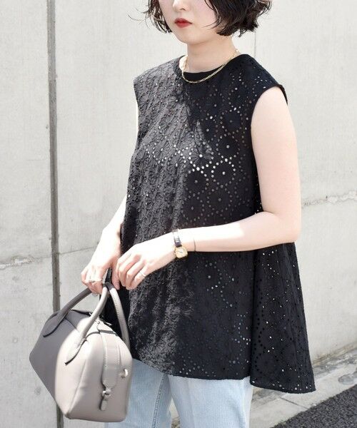 花柄のカットワーク刺繍が華やかなノースリーブブラウス。