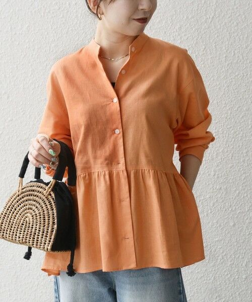 ウエストのペプラムギャザーが目を惹く、リネン混のシャツ。