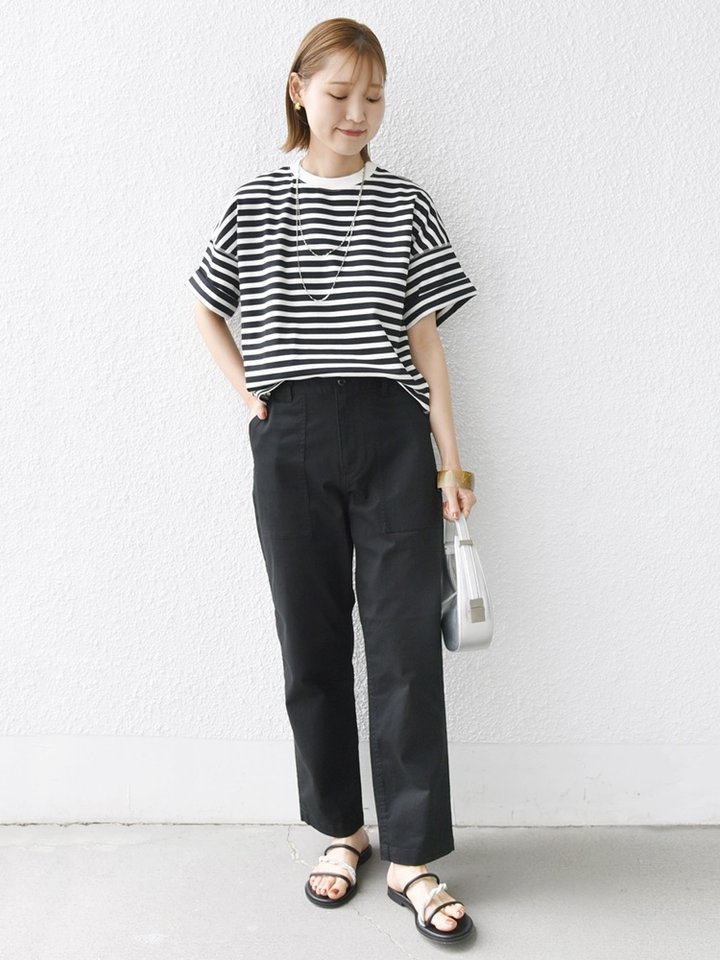 身長:164cm / 普段サイズ:38・MEDIUM / 体型:細身(骨格ウェーブ) 肩幅:なで肩・狭め / パーソナルカラー:イエベ春 【着用レビュー 】 着用アイテム:Tシャツ/ 着用サイズ:ONE SIZE ■着丈:腰くらいまでの丈です。 ■サイズ感:全体的にゆったりとしています。 ■袖丈:肘にかかるくらいの5分袖丈です。袖を折り返す着方も可愛いです。 ■素材感:しっかりとしたややハリ感のあるコットン素材です。 ■着心地:リラックス感のある着心地です。シンプルながらフォルムが可愛い1枚です◎ 着用アイテム:ベイカーパンツ / 着用サイズ:38 ■ウエスト:ゆとりがあり、腰で穿くサイズ感でした。 ■ヒップ:ヒップラインは気になりませんでした。 ■レングス:くるぶしにかかるくらいの丈です。 ■素材感:通年使いやすい厚さのコットン素材です。 ■着心地:ゆったりとしていて穿き心地が楽です。すっきりとしたシルエットできれいめな印象で着用できます。