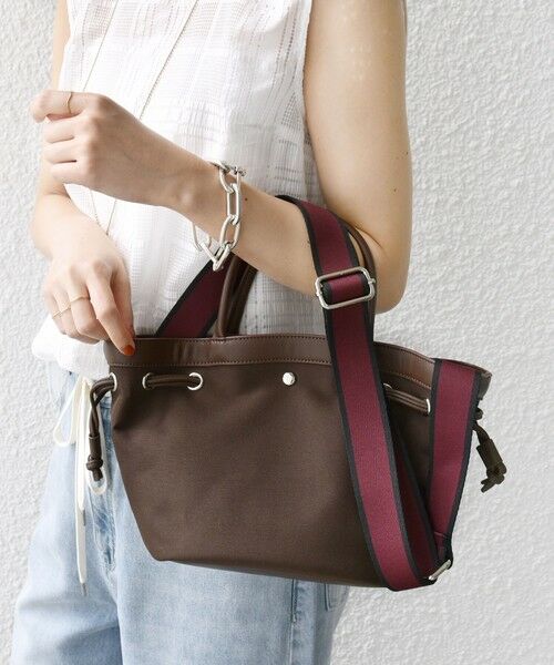 キャンバス見えのポリエステル素材と合皮のドロストデザインが新しいトートバッグです。
