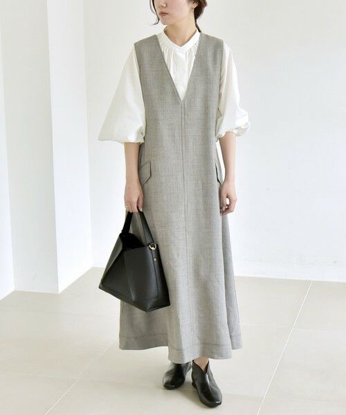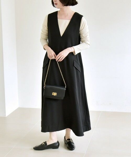 すっきりと開いたVネックラインとステッチが印象的なジャンパースカート。