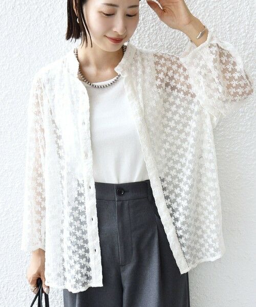 チュール生地に華やかな刺繍を施した 女性らしいシアーシャツ